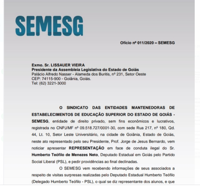 O Sindicato das Entidades Mantenedoras de Estabelecimentos de Educação Superior do Estado de Goiás (Semesg) enviou uma representação ao presidente da Assembleia Legislativa de Goiás, deputado Lissauer Vieira (PSB), pedindo a cassação do deputado estadual Delegado Humberto Teófilo (PSL). O motivo seria a repercussão de vários vídeos realizados pelo parlamentar indo em algumas instituições tanto em Goiânia, quanto no interior no objetivo de articular a redução das mensalidades em meio a pandemia, já que as aulas presenciais foram suspensas. Insatisfeitos, muitos estudantes lançaram campanha nas redes sociais #Reduzjá pressionando as instituições a reduzir o valor das mensalidades.
