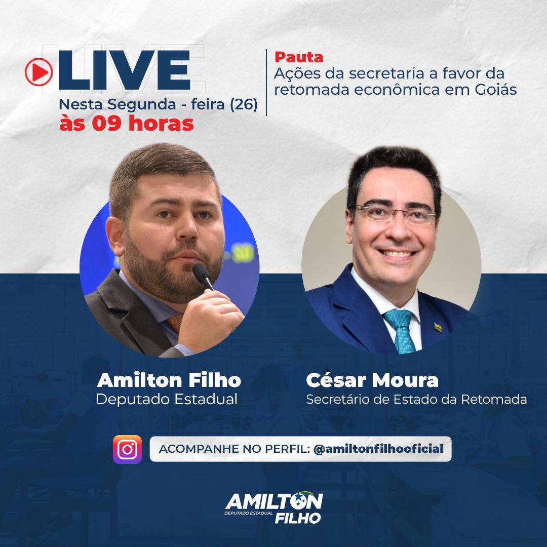Nesta segunda-feira, 26, às 09 horas, o deputado estadual Amilton Filho, presidente da Frente da Retomada na Alego, promoverá uma live com o secretário da Retomada no Governo estadual, César Moura. "Juntos vamos discutir caminhos para que Goiás possa retomar sua economia", destacou o parlamentar.