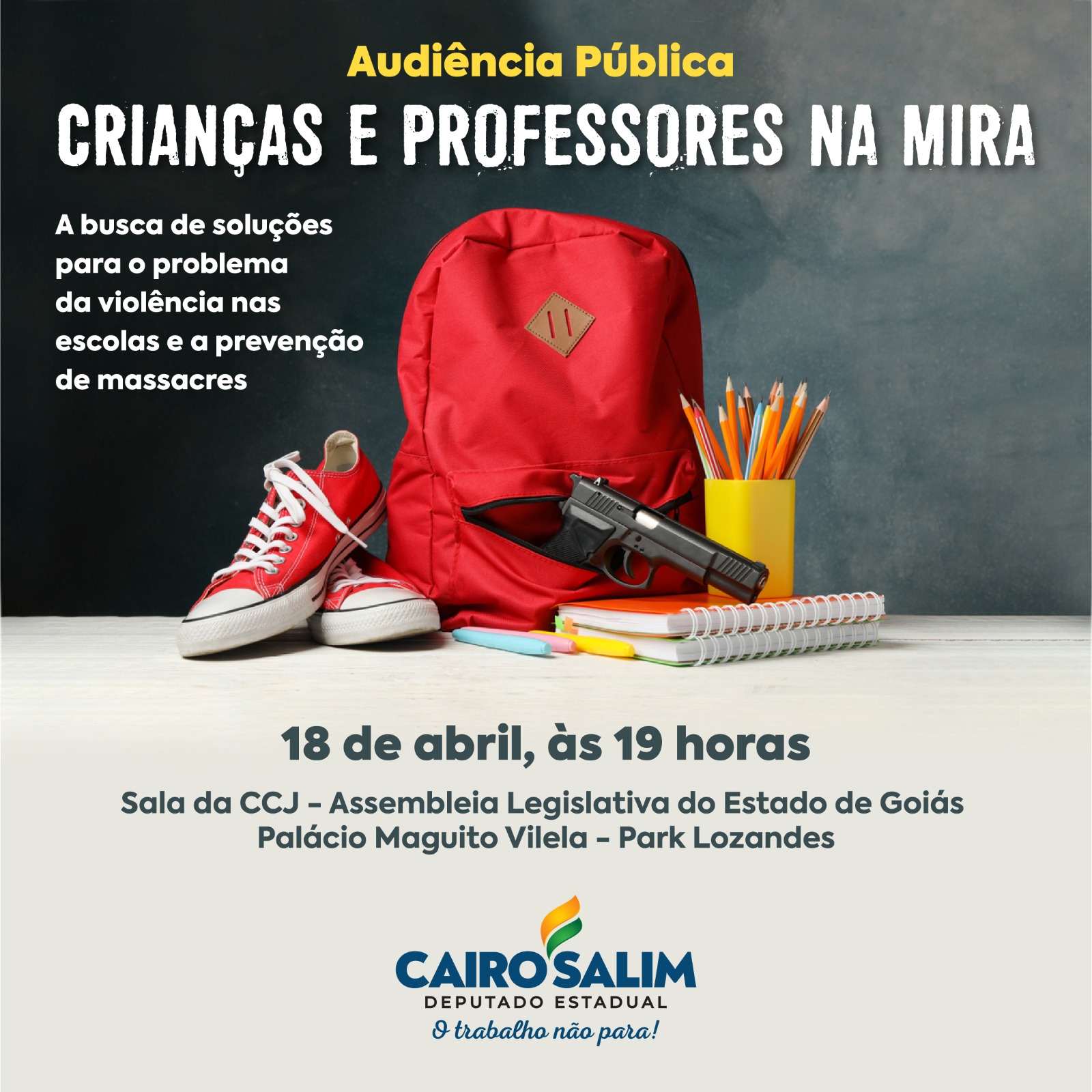 Na próxima terça-feira, 18, o deputado estadual Cairo Salim (PSD) promove uma audiência pública para discutir a segurança em instituições de ensino. O evento será realizado na Sala de Comissões, localizada na Assembleia Legislativa do Estado de Goiás. Os apoiadores da audiência dizem que “o objetivo é debater sobre o aumento de ações violentas em escolas públicas e particulares e, também, sobre formas de buscarmos soluções efetivas para a questão”.