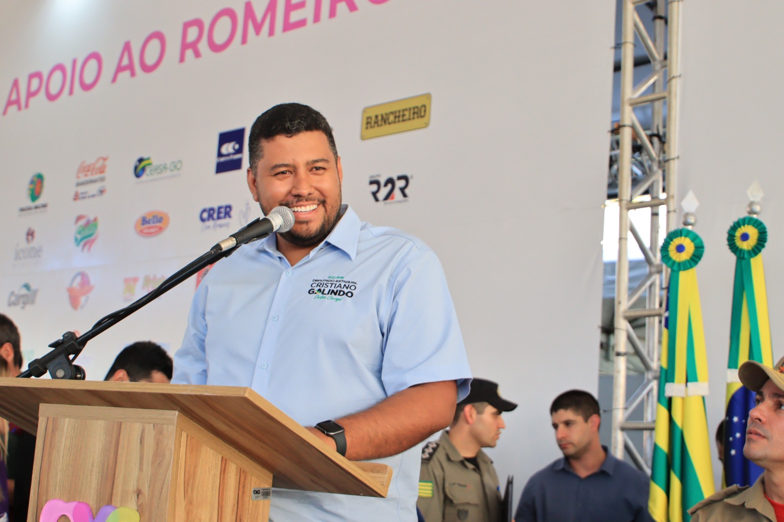 Dando sequência ao cumprimento da agenda, o parlamentar esteve na solenidade de inauguração do Centro de Apoio ao Romeiro (CAR), instalado anualmente durante a Festa em Louvor ao Divino Pai Eterno, pela Organização das Voluntárias de Goiás (OVG), para acolhimento dos devotos que percorrem os 18 quilômetros até Trindade. Desta vez, com a presença do governador Ronaldo Caiado (UB), deputada federal Sylvie Alves (UB), presidente da Agência Goiana de Infraestrutura e Transportes (Goinfra), Lucas Vissotto, prefeitos de cidades da Região Metropolitana e membros da Arquidiocese de Goiânia. Adryanna Caiado, diretora-geral da OVG, afirmou em pronunciamento que os atendimentos oferecidos visam o cuidado com os cidadãos e que o trabalho é aprimorado ano após ano. Segundo ela, a estimativa é de que mais de 300 mil pessoas passem pelo CAR.