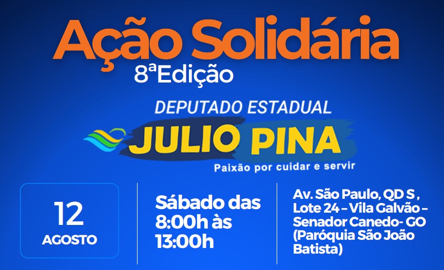 Senador Canedo recebe, neste sábado (12), a 8º Edição do projeto Ação Solidária, promovido pelo deputado estadual Julio Pina (Solidariedade). O evento será realizado na Paróquia São João Batista, na Vila Galvão, e irá oferecer gratuitamente, para a população, atendimentos nas áreas da saúde, assistência social, consultoria jurídica, recreação infantil, corte de cabelo, entre vários outros serviços.