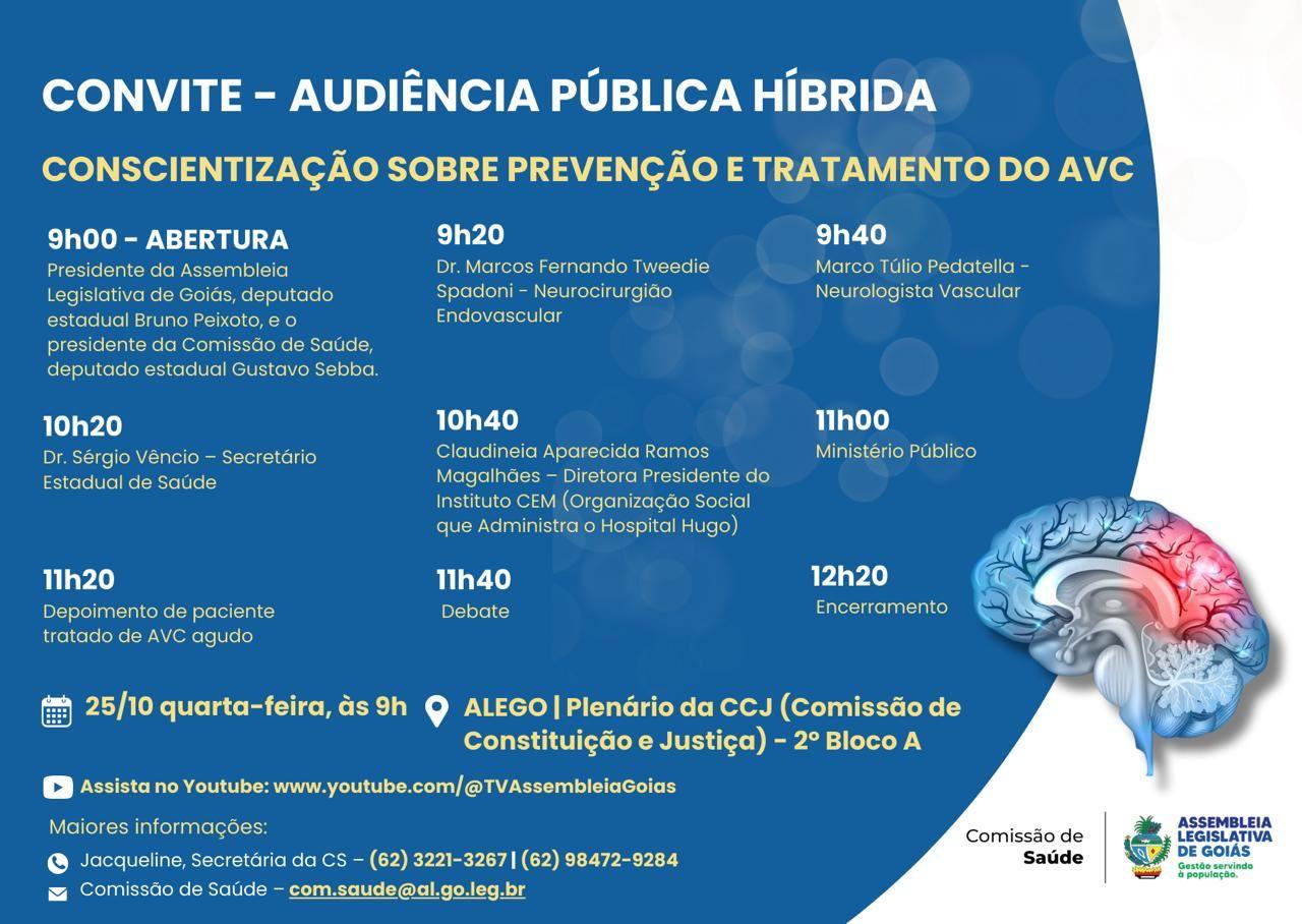 O presidente da Comissão de Saúde, Gustavo Sebba (PSDB), juntamente com os médicos Marcos Fernando Tweedie Spadoni e Marco Túlio Pedatella, estão promovendo uma audiência pública híbrida para tratar da conscientização sobre prevenção e tratamento do Acidente Vascular Cerebral (AVC). O evento ocorrerá nesta quarta-feira, dia 25, às 09:00, no plenário da Comissão de Constituição e Justiça (CCJ) da Assembleia Legislativa de Goiás (Alego).