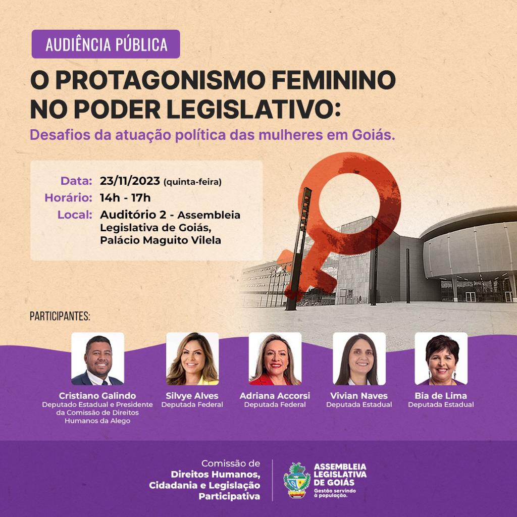 Por propositura do deputado Cristiano Galindo (Solidariedade), a Assembleia Legislativa do Estado de Goiás (Alego) promoverá uma audiência pública para debater a participação feminina na política. O evento acontecerá no próximo dia 23 de novembro, no Auditório 2 da Alego, Palácio Maguito Vilela, a partir das 14 horas. Com a temática “Protagonismo feminino no Poder Legislativo: Desafios da atuação política das mulheres em Goiás”, o parlamentar recepcionará grandes nomes que representam os goianos no Legislativo estadual e na Câmara Federal.