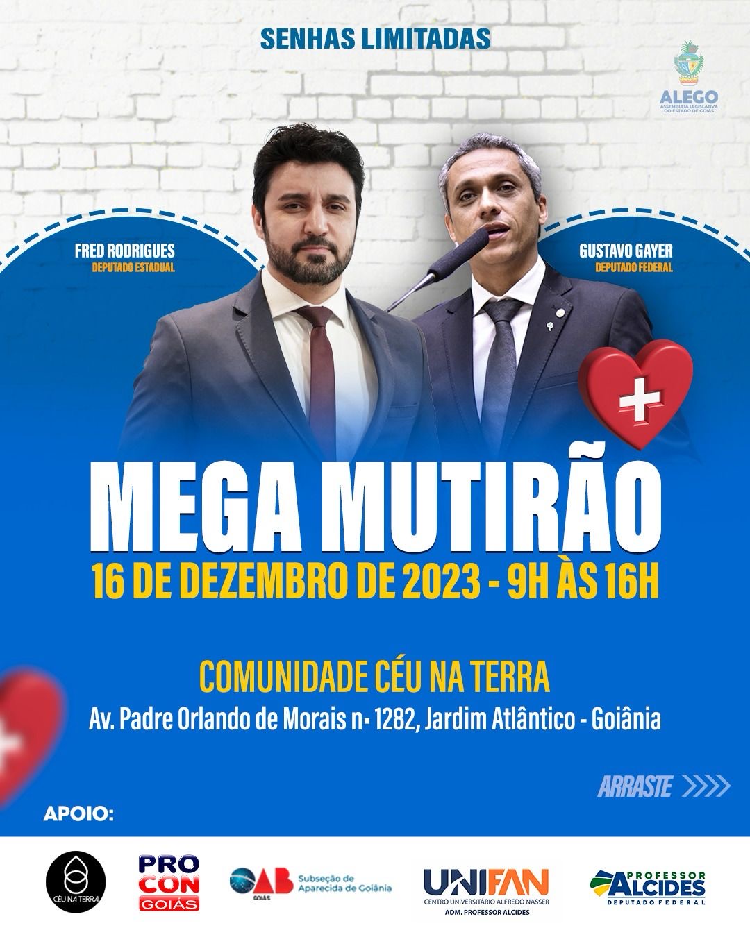 No próximo sábado, dia 16 de dezembro, a partir das 9h da manhã, os deputados Fred Rodrigues e Gustavo Gayer realizarão um Mega Mutirão, oferecendo uma ampla gama de serviços à comunidade.