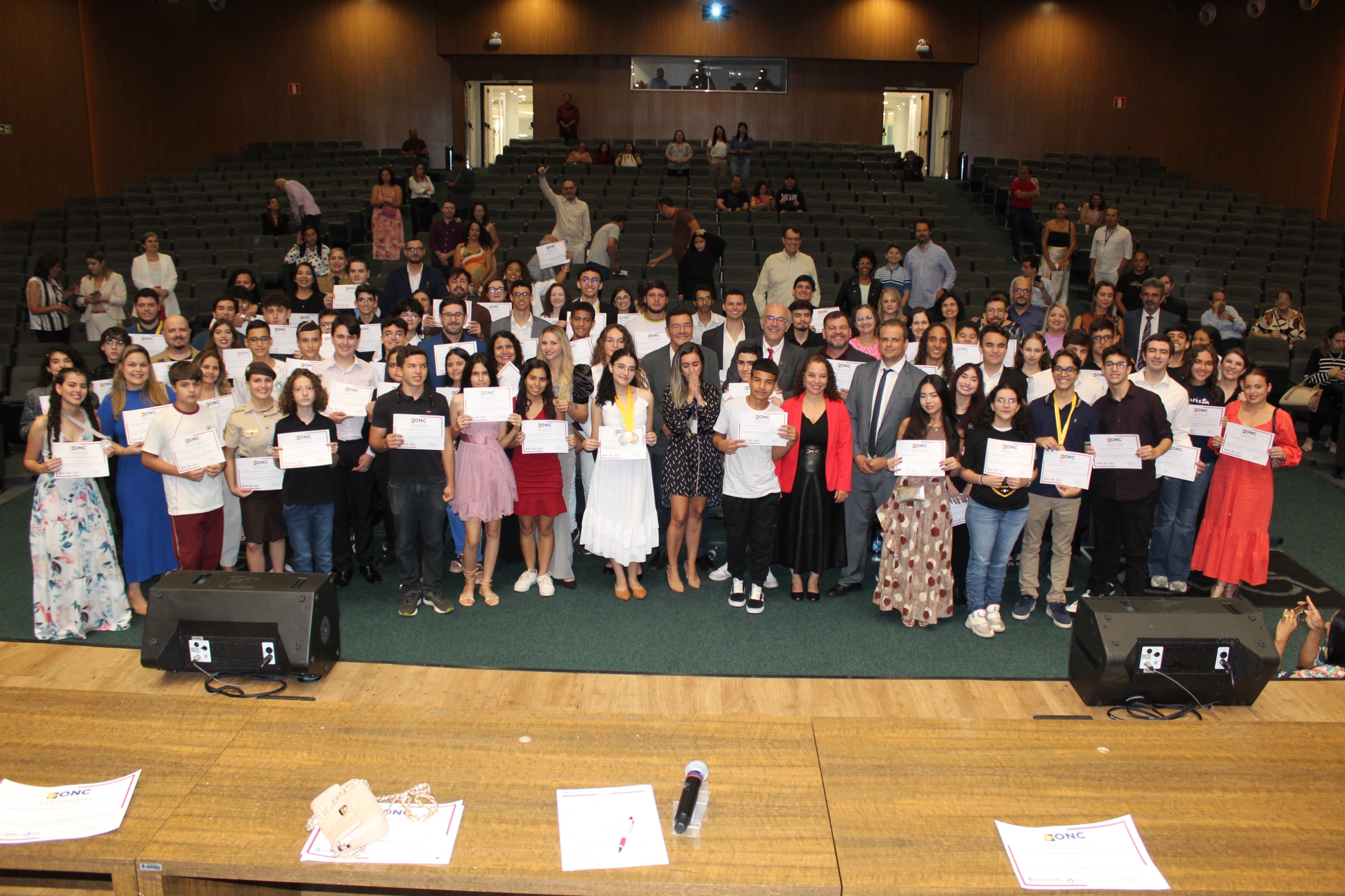 Cerca de duzentas pessoas receberam o Certificado de Honra ao Mérito das mãos do deputado Mauro Rubem e de demais autoridades que fizeram parte da mesa diretiva. Compuseram a mesa dos trabalhos a pró-reitora de Extensão e Cultura da Universidade Federal de Goiás (UFG), Luana Cássia Miranda Ribeiro (representando a reitora Angelita Pereira de Lima); o coordenador regional da Olimpíada de Ciências e diretor de Educação da Associação Brasileira de Química, Renato Cândido da Silva; professor da UFG e assessor especial da presidência da FINEP, Edward Madureira Brasil; gestora de Cultura da Alego, Ana Rita de Castro; estudante premiada pela ONU, Paula Silveira de Castro; e presidente da Egressos e Egressas da UFG, Eliomar Pires Martins.