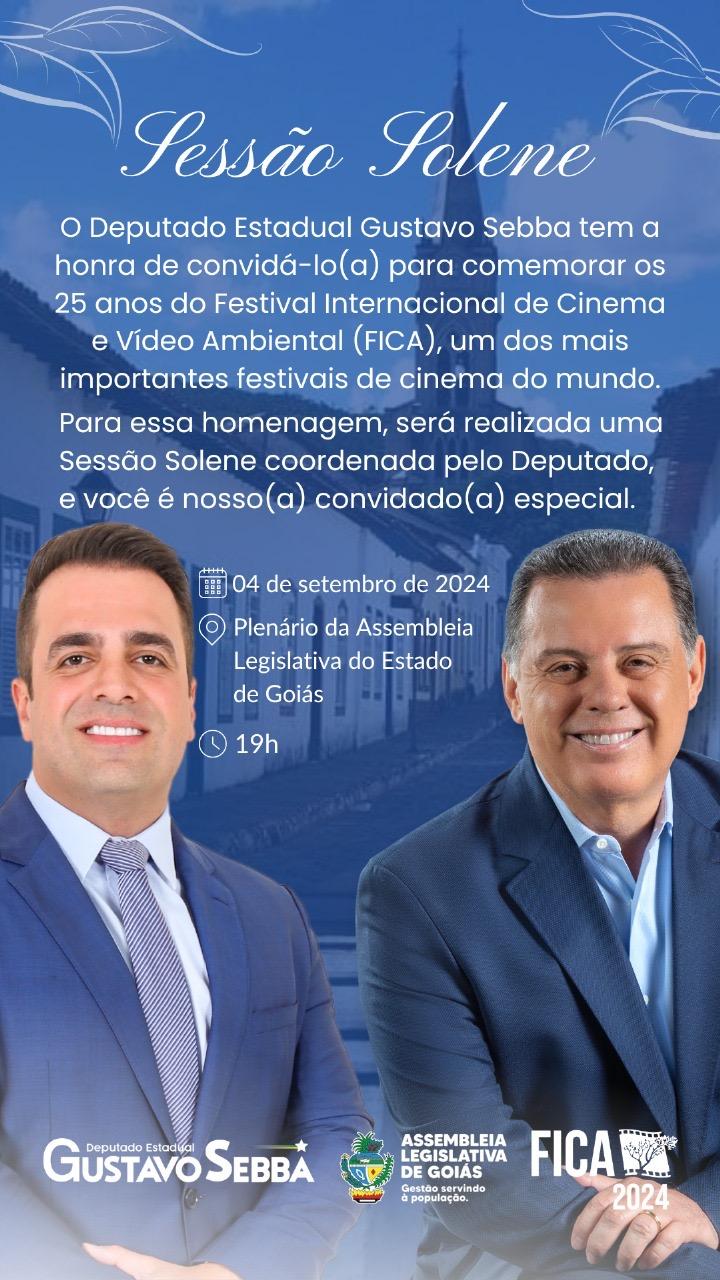 A Assembleia Legislativa do Estado de Goiás, por meio do deputado estadual Gustavo Sebba (PSDB), realizará uma sessão solene nesta quarta-feira, 4, às 19 horas, em homenagem ao 25º aniversário do Festival Internacional de Cinema e Vídeo Ambiental (Fica). O evento ocorrerá no Plenário da Assembleia Legislativa e contará com a presença do ex-governador de Goiás, Marconi Perillo, cineastas, personalidades do mundo cultural e diversas autoridades.