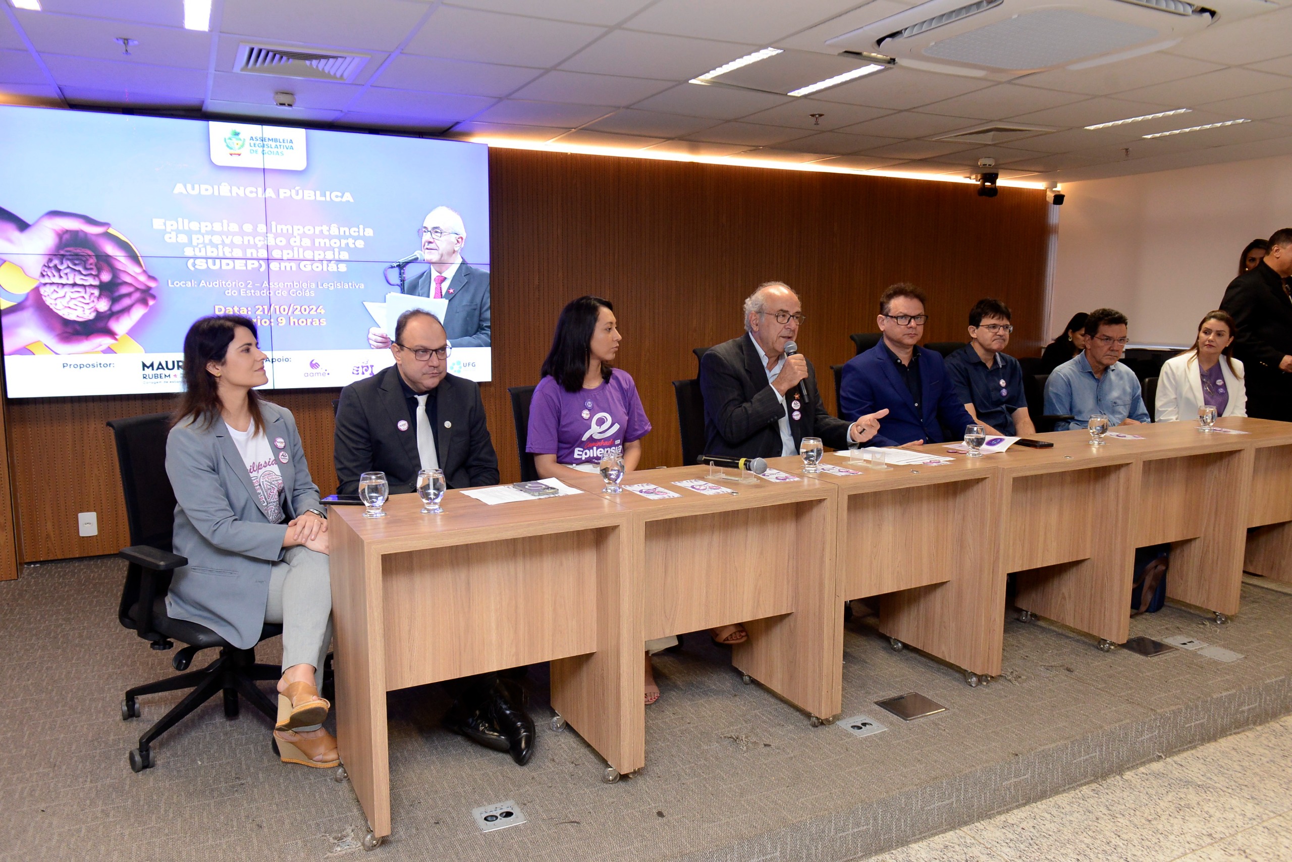 Além do deputado, que presidiu a reunião pública, compuseram a mesa de trabalhos: embaixadora da Associação Brasileira de Epilepsia do DF, Thayse Fernandes dos Santos; presidente do N20 e Neurociência 20/Brasil 2024, Marcos Wagner de Sousa Porto; professor e coordenador do Ambulatório de Epilepsia de Difícil Controle da Faculdade de Medicina da Universidade Federal de Goiás, Hélio Fernandes da Silva Filho; professor, coordenador e representante da Pró-Reitoria de Graduação Núcleo Intersetorial de Direitos Humanos, Rezende Bruno de Avelar, neste ato sendo representado pelo senhor Flávio Alves Barbosa; professora doutora do Departamento de Ciências Fisiológicas da Universidade Federal de Goiás, Aline Priscila Pansani; fonoaudióloga da equipe multidisciplinar do Centro Municipal de Apoio à Inclusão de Goiânia, Tatiane Vilela; vereador eleito por Goiânia, professor Edward Madureira Brasil.