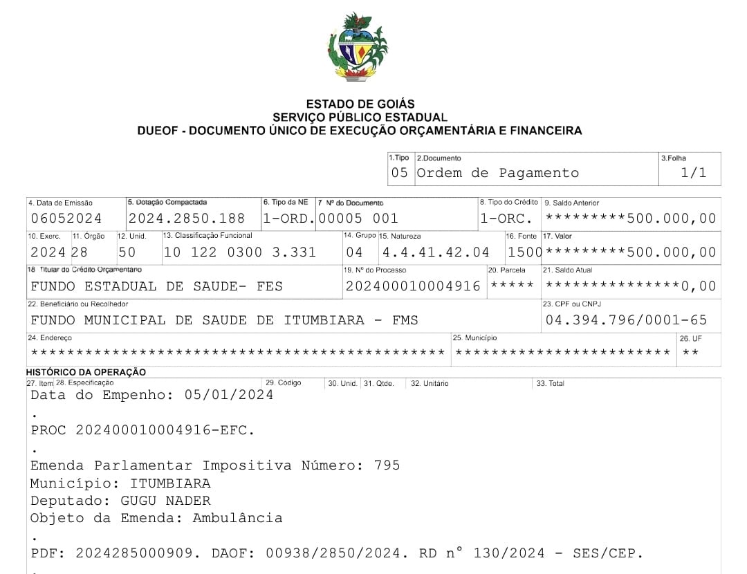 O deputado Gugu Nader (Avante) está cobrando da Prefeitura de Itumbiara a efetiva aplicação da emenda parlamentar de R$ 500 mil, destinada por ele para a compra de uma ambulância com UTI Neonatal. O valor já foi repassado ao município e está na conta do Fundo Municipal de Saúde, mas, até o momento, a aquisição do veículo não foi realizada.