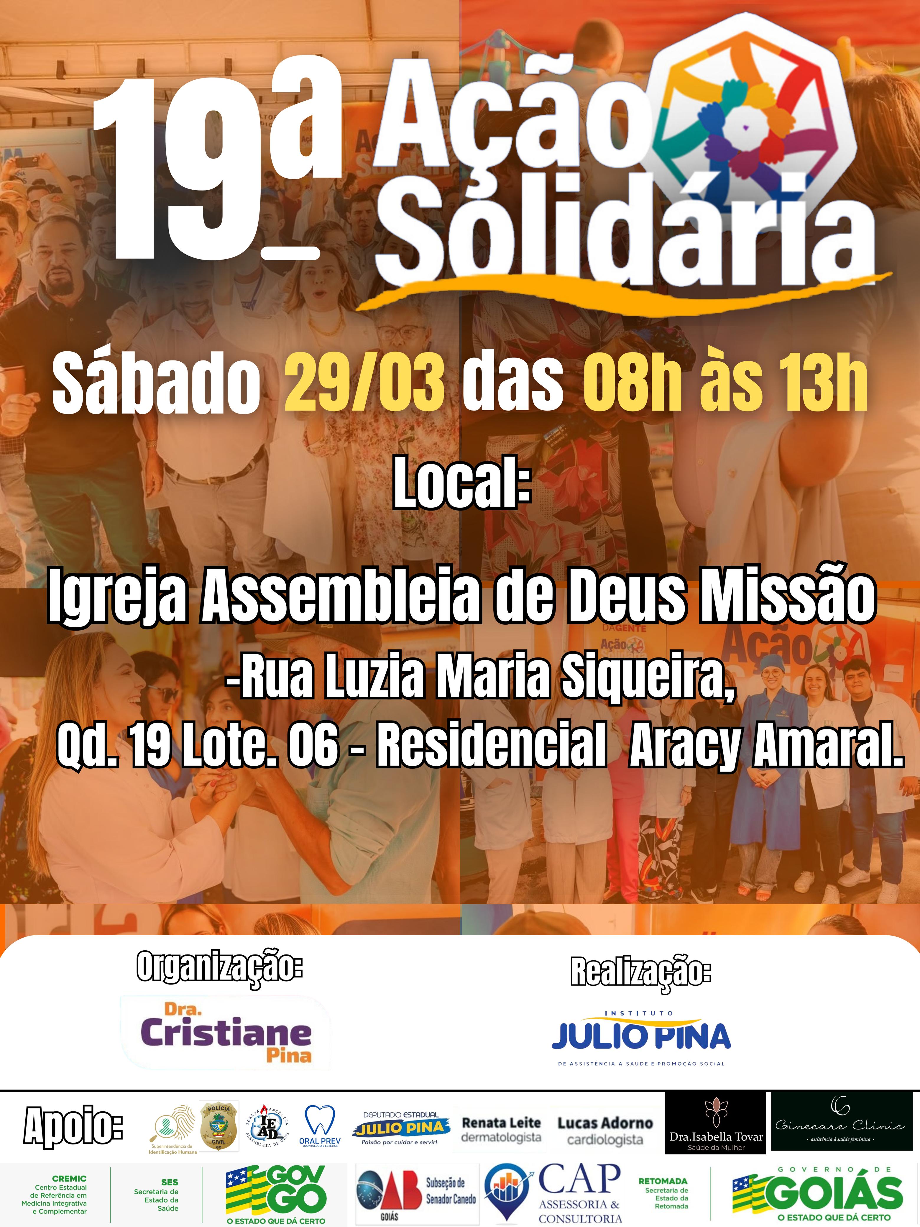 A 19ª edição do Projeto Ação Solidária, promovida pelo deputado estadual Julio Pina (Solidariedade) e pela Dra. Cristiane Pina, será realizada no próximo sábado, dia 29, em Senador Canedo. O evento acontecerá das 8 às 13 horas, na sede da Igreja Assembleia de Deus – Missão, localizada na Rua Luzia Maria Siqueira, QD 19, Lote 06, Residencial Aracy Amaral.