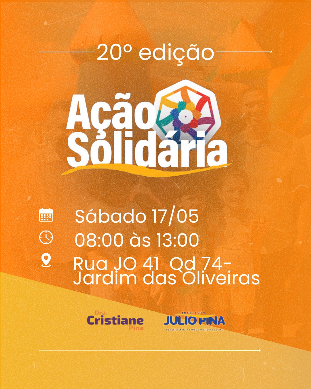 A 20ª edição do Projeto Ação Solidária, promovida pelo deputado estadual Julio Pina (Solidariedade) e pela Dra. Cristiane Pina, será realizada no próximo sábado, dia 17, em Senador Canedo. O evento acontecerá das 8 às 13 horas, na Rua JO 41 Qd 74- Jardim das Oliveiras.
