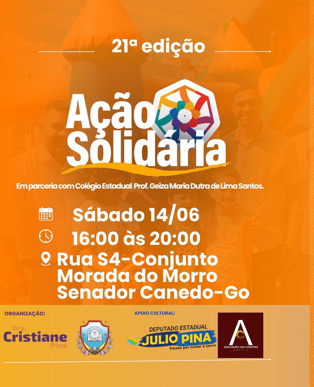 A 21ª edição do Projeto Ação Solidária, promovido pelo deputado estadual Julio Pina (Solidariedade) e pela Dra. Cristiane Pina, será realizada neste sábado, 14 de junho, em Senador Canedo, em parceria com o Colégio Estadual Professora Geiza Maria Dutra de Lima Santos.
