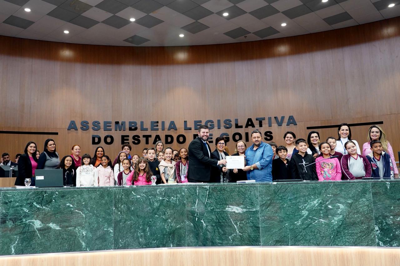 Cerca de 40 alunos da Escola Municipal Professora Maria Eugênia Borges, de Damolândia, visitaram, na última quarta-feira, 13, a sede da Assembleia Legislativa do Estado de Goiás (Alego). Eles participaram de uma palestra ministrada por servidores da Casa e, de maneira lúdica, aprenderam conceitos de cidadania e de democracia. Em seguida, fizeram um tour guiado pelo prédio, conheceram o plenário e subiram à tribuna onde receberam um certificado de participação do projeto instituído pela Casa neste ano, chamado Deputados e Deputadas do Futuro.