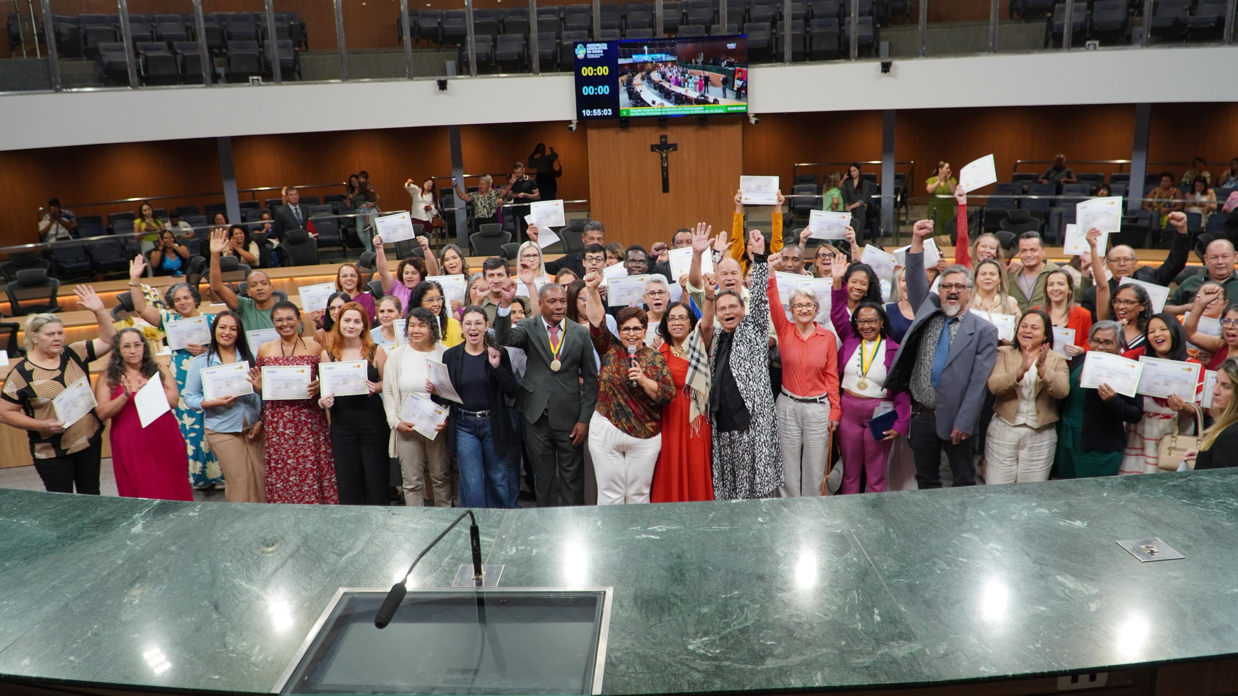 Por iniciativa da deputada estadual Bia de Lima (PT), os funcionários administrativos da educação pública em Goiás, tanto da rede estadual quanto das redes municipais, foram homenageados com o Certificado de Mérito Legislativo e a Medalha Pedro Ludovico Teixeira, que foi entregue aos agentes educacionais de apoio administrativo Rita Maria Maranduba e Bruno Tomaz de Aquino.