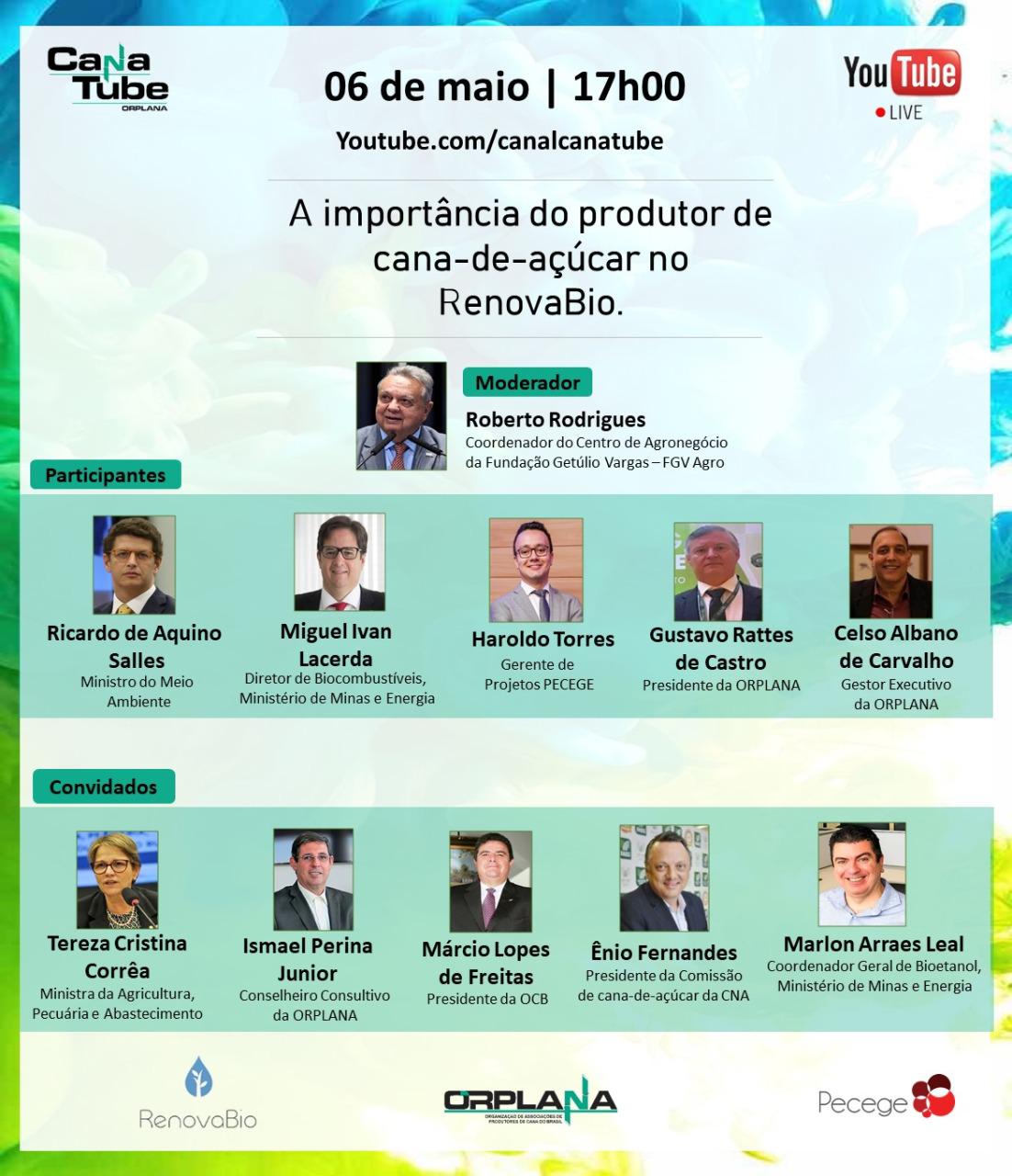 Com o tema “A importância do produtor de cana-de-açúcar no RenovaBio” e mediado pelo coordenador do Centro de Agronegócio da Fundação Getúlio Vargas (FGV-Agro), Roberto Rodrigues, o debate virtual contará com as participações do ministro do Meio Ambiente, Ricardo Salles; diretor de biocombustíveis do Ministério de Minas e Energia, Miguel Ivan Lacerda; gerentes de projetos da PECEGE, Haroldo Torres; presidente da Orplana, Gustavo Rattes de Castro e gestor executivo da entidade, Celso Albano.