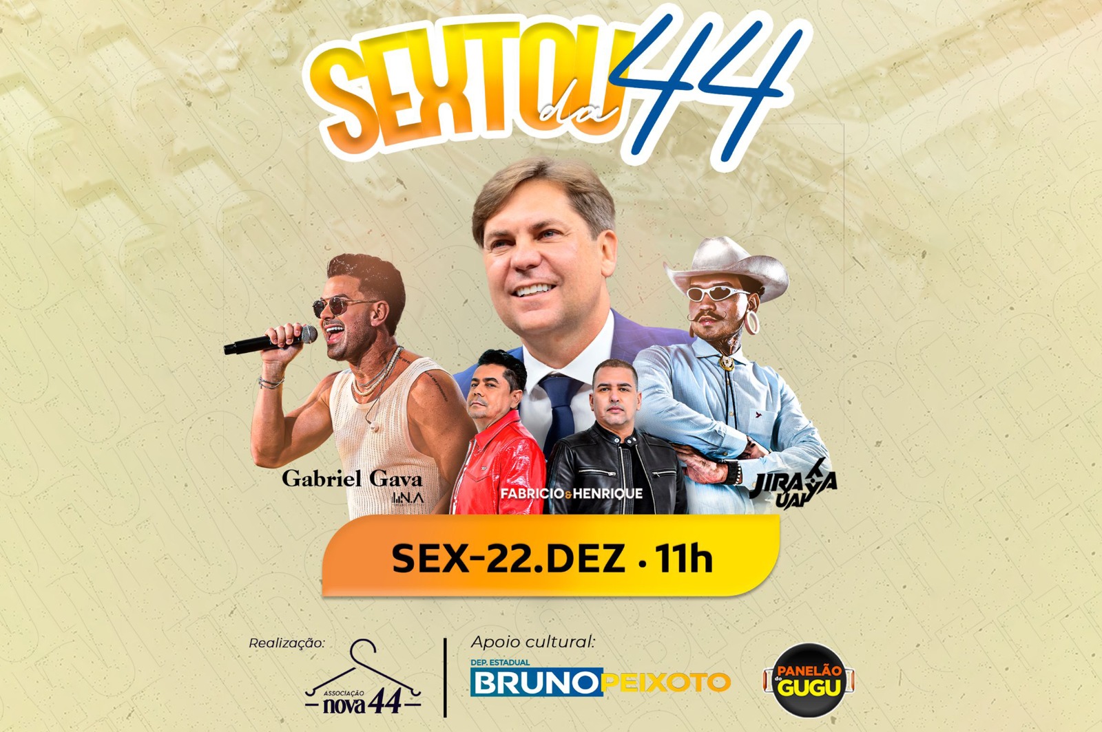 Além do tradicional Panelão do Gugu, do deputado estadual Gugu Nader, o "Sextou da 44" terá na programação shows com a cantora Maira Lemos, com os cantores sertanejos Gabriel Gava e Fabrício e Henrique e, ainda, apresentação do DJ Jiraya Uai, um dos principais nomes do eletrofunk de todo o País. O evento será realizado em parceria com a Associação Nova 44.