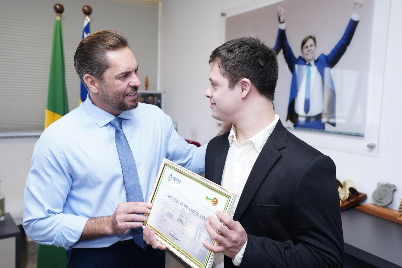 Premiado nacionalmente, jovem goiano com Síndrome de Down foi homenageado pelo presidente do Legislativo estadual em reconhecimento ao seu empenho pela inclusão e pela defesa das pessoas com deficiência.
