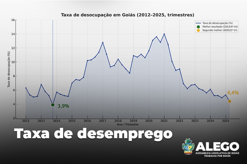 O Estado de Goiás registrou, no segundo trimestre de 2025, a segunda menor taxa de desocupação desde o início de 2012. O índice foi de 4,4%, só não inferior ao de 3,9% verificado nos últimos três meses de 2013.